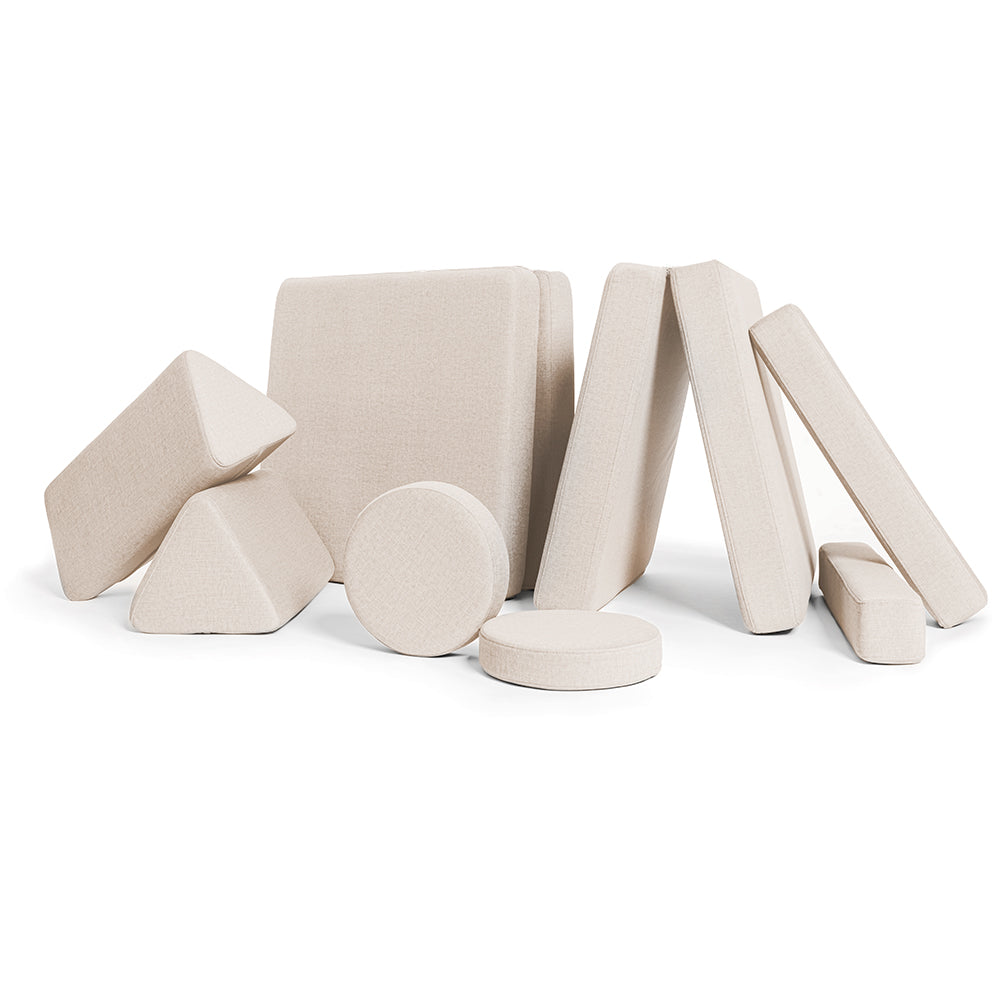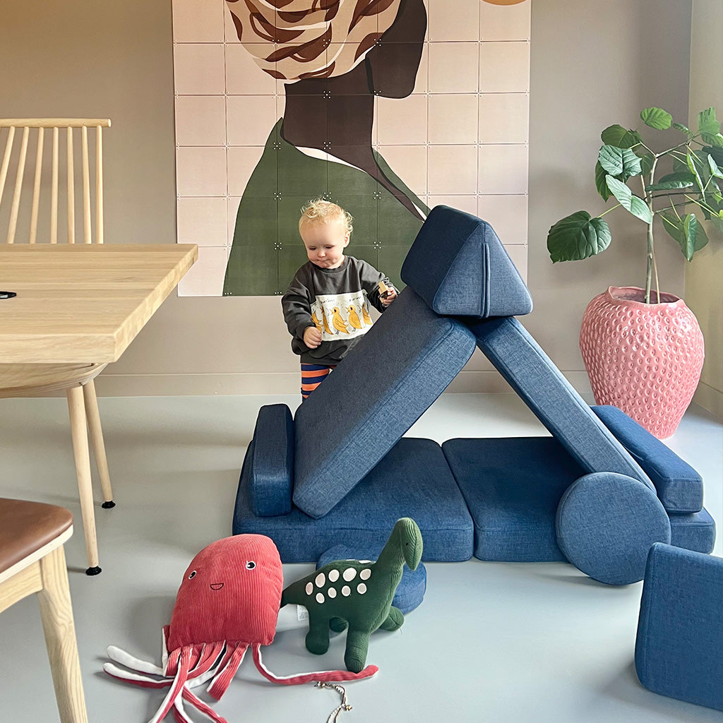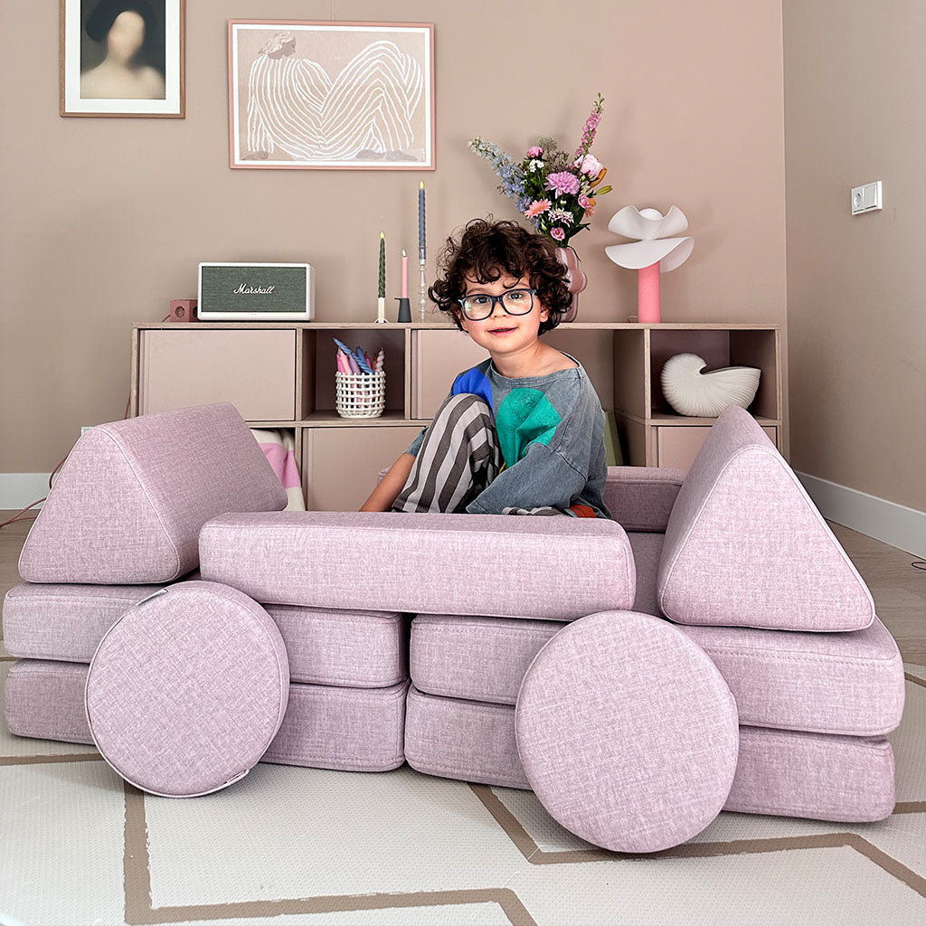 Shappy comes with two mattress-quality base cushions, two armrests, two round pillows, and triangular backrest pillows. The fabric's natural resilience keeps everything stable and comfy, whether you're playing or lounging.
