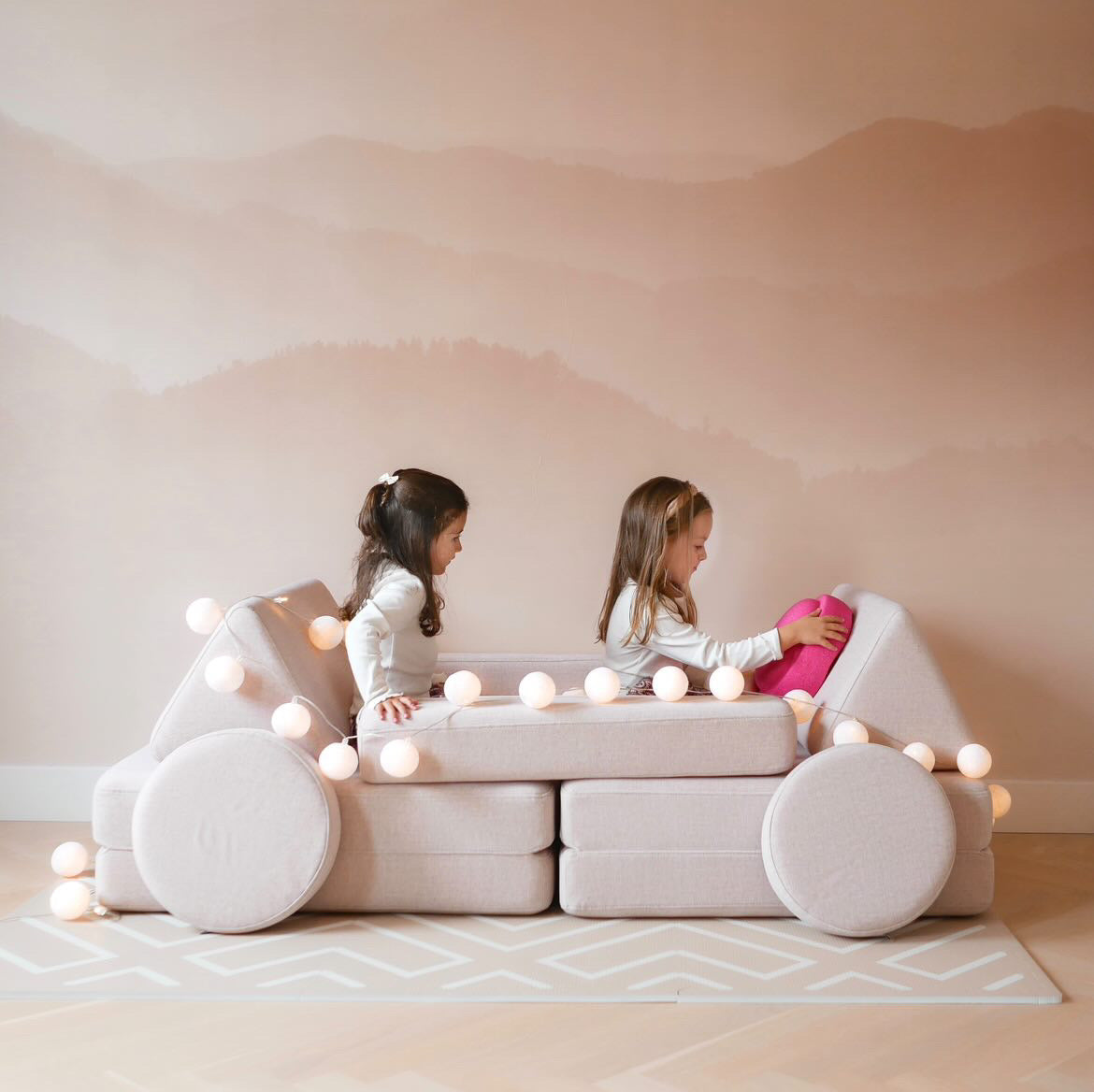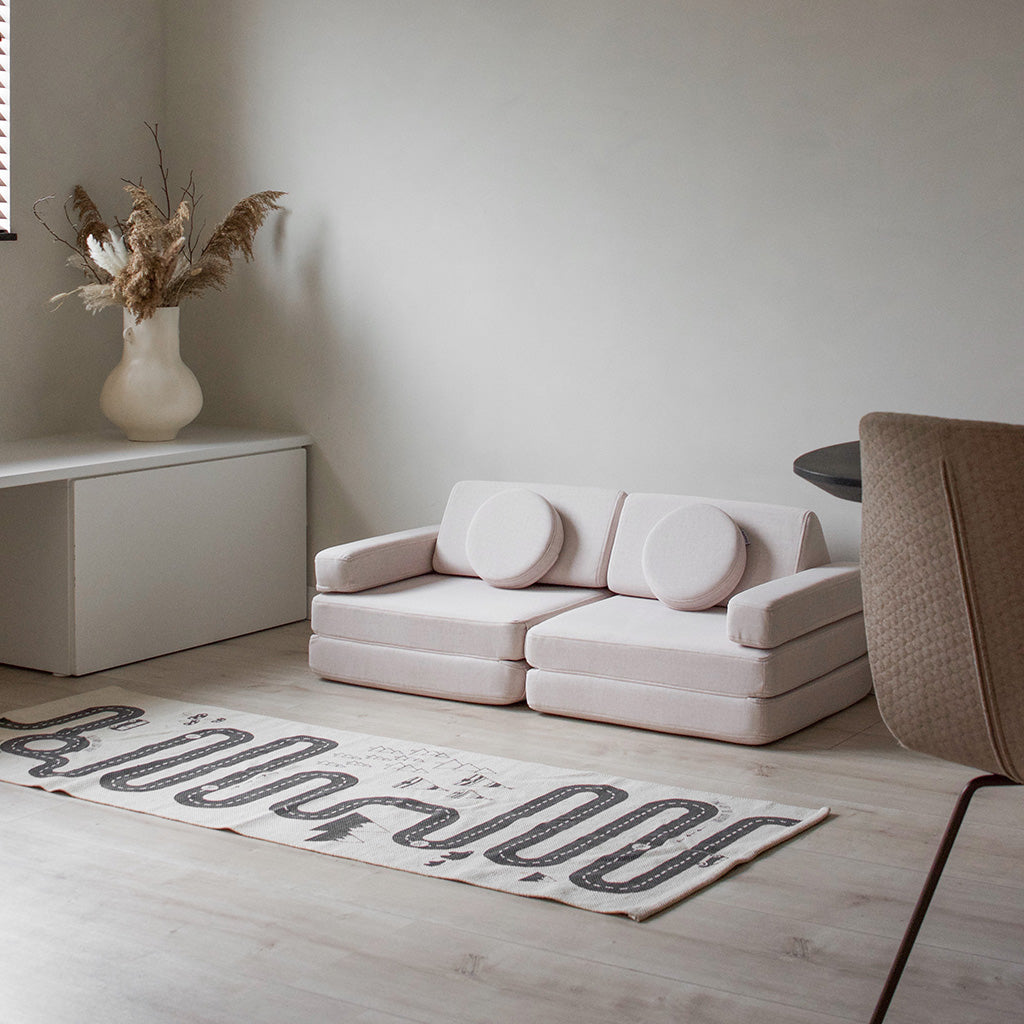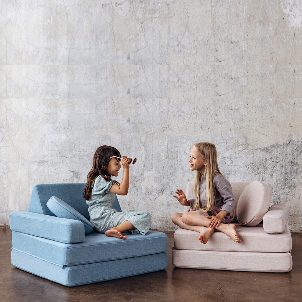 Shappy comes with two mattress-quality base cushions, two armrests, two round pillows, and triangular backrest pillows. The fabric's natural resilience keeps everything stable and comfy, whether you're playing or lounging.